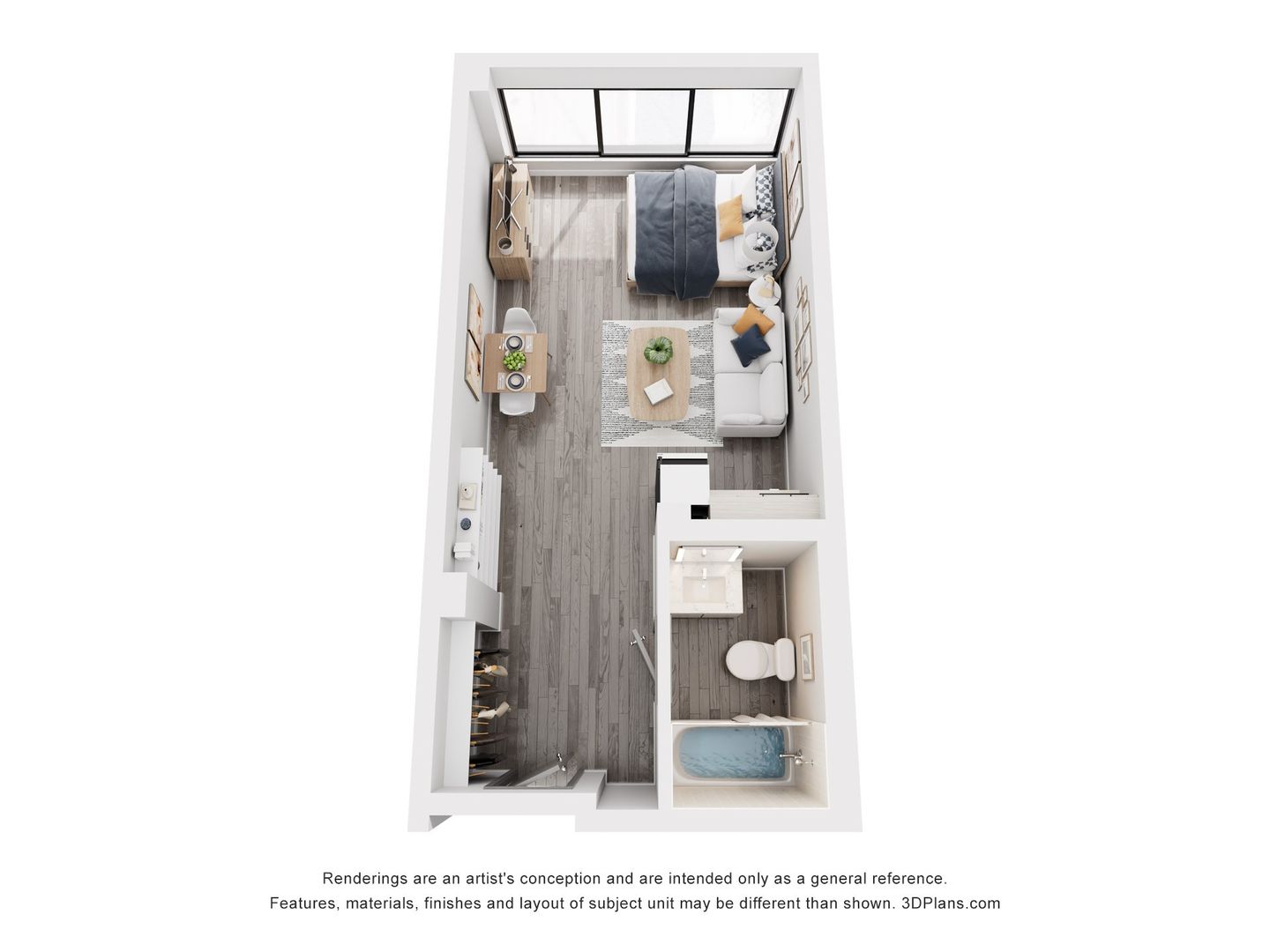 Photographs of studio are staged; studio comes unfurnished.